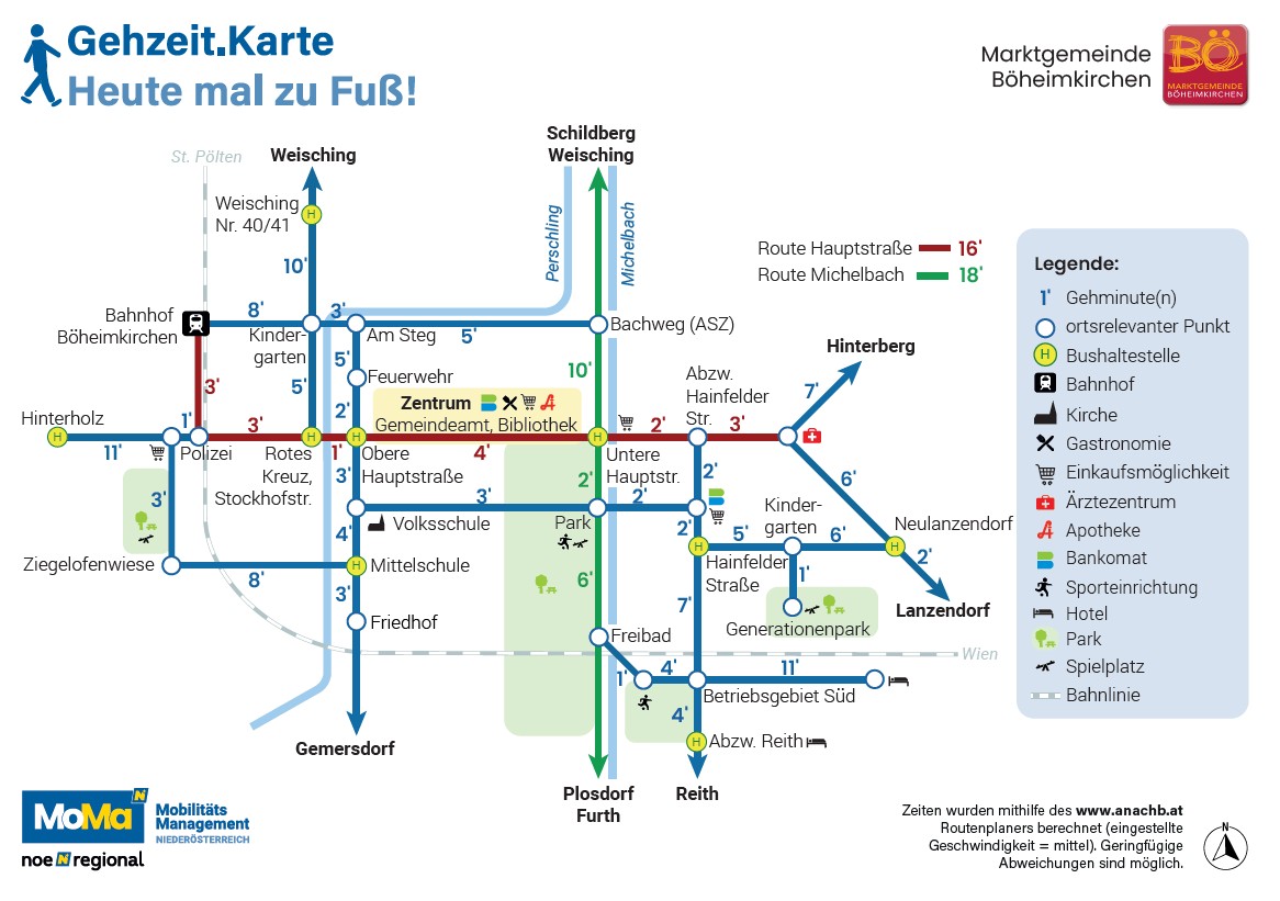 Im Rahmen der Veranstaltung präsentierte Gemeinderätin Ingrid Posch gemeinsam mit dem Mobilitätsmanagement NÖ-Mitte die neu entwickelte Gehzeit.Karte Böheimkirchen. Diese stellt zentrale Ziele im Ort schematisch – ähnlich einem U-Bahn Plan – dar und gibt Entfernungen in Gehminuten statt in Kilometern an. Ziel ist es, die Bevölkerung verstärkt zum Zufußgehen im Alltag zu motivieren und die kurzen Wege im Ort sichtbar zu machen.